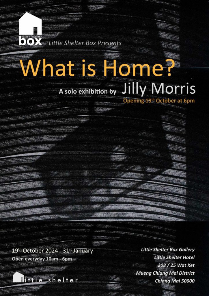 จิลลี่ มอร์ริส (Jilly Morris) ศิลปินชาวอังกฤษ อดีต Graphic Designer ของ BBC ได้ตั้งคำถามผ่านผลงานต่างๆ ในนิทรรศการเดี่ยวใหม่ที่มีชื่อว่า ‘บ้านคืออะไร?’ (‘What Is Home?’) ณ Little Shelter Hotel เชียงใหม่ ระหว่างวันที่ 19 ตุลาคม 2567 – 31 มกราคม 2568 เวลา 10.00 – 18.00 น.