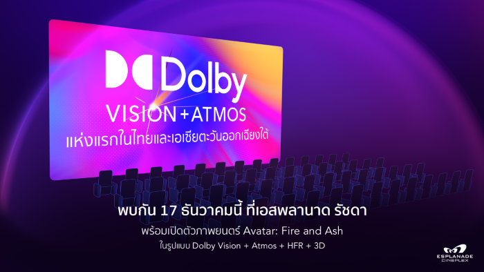 เมเจอร์ ซีนีเพล็กซ์ กรุ้ป เดินหน้าปฏิวัติวงการโรงภาพยนตร์ไทย ยกระดับมาตรฐานโรงภาพยนตร์ไทยสู่ระดับอินเตอร์ เปิดตัว “โรงภาพยนตร์ Dolby Vision + Atmos” ด้วยเทคโนโลยีภาพและเสียงล้ำสมัยที่สุดในโลก พร้อมให้บริการอย่างเป็นทางการในวันที่ 17 ธันวาคม 2568 ณ โรงภาพยนตร์ที่ 4 เอสพลานาด ซีนีเพล็กซ์ รัชดา ถือเป็นโรงแรกในประเทศไทยและแห่งแรกในเอเชียตะวันออกเฉียงใต้ เตรียมต้อนรับภาพยนตร์ฟอร์มยักษ์ “AVATAR : FIRE AND ASH”