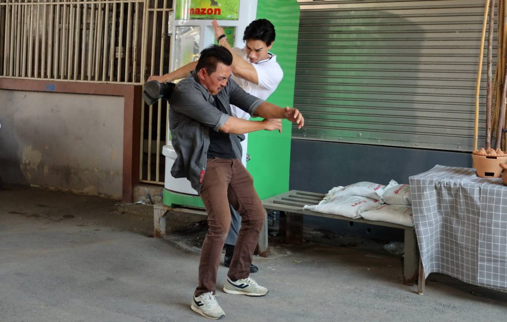 หลังจากฉากนั้นก็ถึงฉากคิวบู๊ของสองหนุ่ม “กบิล – มุทธา” รวมไปถึง “อรชา” ผู้กำกับฯ ก็ให้นักแสดงทั้งสามซ้อมคิวกับนักแสดงแอ็คชั่นก่อน ซึ่งก็เห็นได้ชัดว่าทั้งสองหนุ่มดูจะรับจังหวะคิวได้ดี ด้านนางเอกสาวของเราแม้จะดูไม่ถนัด แต่เห็นความจริงจังในตอนซ้อมโดยเฉพาะท่ายกไม้ฟาดที่ “มะเหมี่ยว” ลองทำอยู่หลายครั้ง จากนั้นก็เริ่มถ่ายทำโดยผู้กำกับฯ ขอเก็บคิวบู๊ในแต่ละคัทของแต่ละคน เพื่อความสวยงาม ปรากฏว่าผ่านฉลุย แม้ตอนคิว “กบิล – ตรัย” กำลังคุยกับคนร้าย คนร้ายอีกคนก็เล็งปืนไปที่สองหนุ่ม “อรชา” ที่โผล่มาเห็นก็คว้าไม้ฟาดคนร้ายจนร้องโอดครวญ ก็แสดงได้ดีไม่มีสะดุดเช่นกัน แล้วคราวนี้ก็ถึงคิวถ่ายฉาก 3 นักแสดงต้องวิ่งหนีลูกปืนจากพวกนักเลงท่ามกลางแดดร้อนเปรี้ยง ต่างให้แยกย้ายกันไปคนละทางก่อนกลับมาเจอกัน ซึ่ง “กบิล” กับ “อรชา” ไปด้วยกัน ส่วน “ตรัย” แยกไปอีกทาง แล้ว “กบิล” กับ “อรชา” ก็หลบไปแอบซ่อนที่มุมในร้านค้าแห่งหนึ่ง การถ่ายทำฉากนี้แม้จะร้อนเหงื่อซึมแต่ก็ผ่านไปได้ด้วยดี แต่สำหรับคนดูบอกได้เลยว่าฉากนี้มีหวาดเสียว! เพราะในเรื่องจู่ๆนักเลงก็เดินเข้ามาดูตรงที่ “กบิล” และ “อรชา” หลบอยู่ แหมพี่นักเลงก็แสดงจนรู้สึกลุ้น…ก่อนมาตบท้ายที่พระนางยืนเบียดกันในมุมประตูแคบๆที่หน้าห่างกันแค่คืบ จู่ๆก็มีความหวานขึ้นมาให้คนดูเขินไปด้วย แต่มาสะดุดเมื่อน้องชายตัวดีโผล่มาผิดจังหวะ