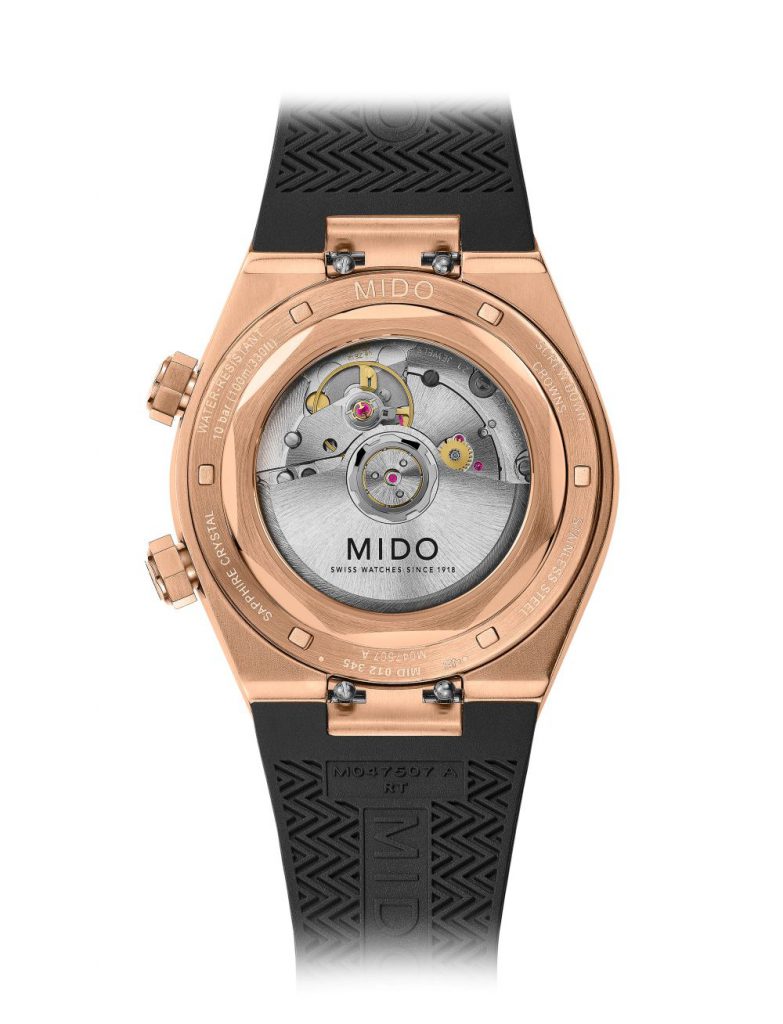 มัลติฟอร์ท 8 ทู คราวน์ เฉดใหม่นี้ เป็นเรือนเวลาที่ผสานความงามและความแม่นยำไว้ด้วยกันอย่างสมบูรณ์แบบ ด้วยหน้าปัดขนาด 40 มิลลิเมตรทรงแปดเหลี่ยมในโทนสีโรสโกลด์ตัดกับพื้นหน้าปัดสีดำด้าน ตกแต่งด้วยลวดลายเส้นแนวนอน เสริมความแข็งแแกร่งด้วยตัวเรือนที่ทำจากสแตนเลสสตีลขัดซาตินและขัดเงา พร้อมเคลือบ PVD สีโรสโกลด์ที่ช่วยเพิ่มความเปล่งประกายอย่างมีระดับ และครอบด้วยกระจกคริสตัลแซฟไฟร์ที่เคลือบสารกันการสะท้อนทั้งด้านในและด้านนอกเพื่อความคมชัดในการอ่านค่า มาพร้อมขอบด้านในแบบหมุนได้ที่เกิดจากการทำงานของเม็ดมะยมที่ตำแหน่ง 2 นาฬิกามาพร้อมกับเข็มชั่วโมงและเข็มนาทีที่ใช้เทคนิคการขัดซาตินบริเวณร่องตรงกลาง เคลือบด้วยสารเรืองแสงซูเปอร์ลูมิโนวา (Super-luminova®) สีขาว ควบคู่ไปกับเข็มวินาทีที่ถูกเจียระไนพร้อมเคลือบ PVD สีโรสโกลด์ โดยมีช่องหน้าต่างแสดงวันที่ มาพร้อมสายยางสีดำในลวดลายปั๊มนูนตัดกับขอบสีโรสโกลด์ได้อย่างลงตัว ในขณะเดียวกันด้วยระบบล็อกสายแบบบานพับทำให้สามารถถอดเปลี่ยนสายได้อย่างสะดวกสบาย นอกจากนี้ฝาหลังแบบเปลือยยังเผยให้เห็นกลไกการทำงานของตัวเรือนที่กำลังขับเคลื่อนด้วยกลไกคาลิเบอร์ 72 (Caliber 72) ที่สามารถสำรองพลังงานได้สูงสุดถึง 72 ชั่วโมง มาพร้อมบาลานซ์สปริงนิวาครอง (Nivachron™) ช่วยเสริมความทนทานต่อแรงกระแทกและสนามแม่เหล็กได้อย่างมีประสิทธิภาพ พร้อมสลักโลโก้ MIDO ที่สะท้อนความชำนาญด้านเรือนเวลาของ MIDO และยังสามารถในการกันน้ำลึกได้ถึง 100 เมตร