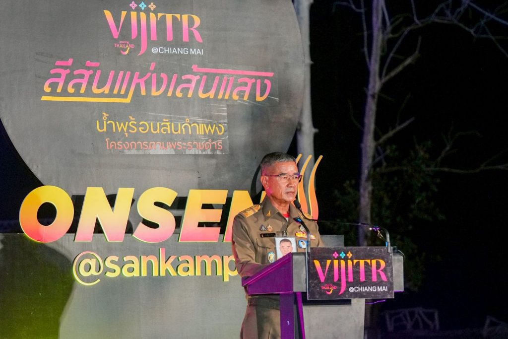 พลเอก เฉลิมชัย สิทธิสาท องคมนตรี กล่าวว่า หลังจากที่โครงการหมู่บ้านสหกรณ์สันกำแพง ตามพระราชดำริได้ถือกำเนิดขึ้นเมื่อปี พ.ศ. 2518 ตามพระราชดำริพระบาทสมเด็จพระบรมชนกาธิเบศร มหาภูมิพลอดุลยเดชมหาราช บรมนาถบพิตร ในหลวงรัชกาลที่ 9 ต่อมาในปี พ.ศ. 2527 ได้มีการพัฒนาพื้นที่ให้เป็นแหล่งท่องเที่ยวประเภทน้ำพุร้อนธรรมชาติ แหล่งท่องเที่ยวเชิงสุขภาพที่เป็นตัวอย่างการดำเนินธุรกิจน้ำพุร้อนในประเทศ ซึ่งได้สร้างงาน สร้างอาชีพ สร้างรายได้ ให้กับประชาชนในพื้นที่มาอย่างยั่งยืน การจัดงาน “วิจิตร@เชียงใหม่ สีสันแห่งเส้นแสง น้ำพุร้อนสันกำแพง โครงการตามพระราชดำริ ตอน ออนเซ็น@สันกำแพง” ถือว่าเป็นกิจกรรมส่งเสริมการท่องเที่ยวที่จะเปิดมุมมองทางการท่องเที่ยวใหม่ให้กับน้ำพุร้อนสันกำแพง ซึ่งปัจจุบัน น้ำพุร้อนสันกำแพงได้มีการดำเนินการอยู่ในแนวทางโครงการพระราชดำริและเศรษฐกิจพอเพียงในพระบาทสมเด็จพระบรมชนกาธิเบศรมหาภูมิพลอดุลยเดชมหาราชบรมนาถบพิตร เพื่อสืบสานพระราชปณิธานตามหลักการเศรษฐกิจพอเพียงสู่ความยั่งยืน