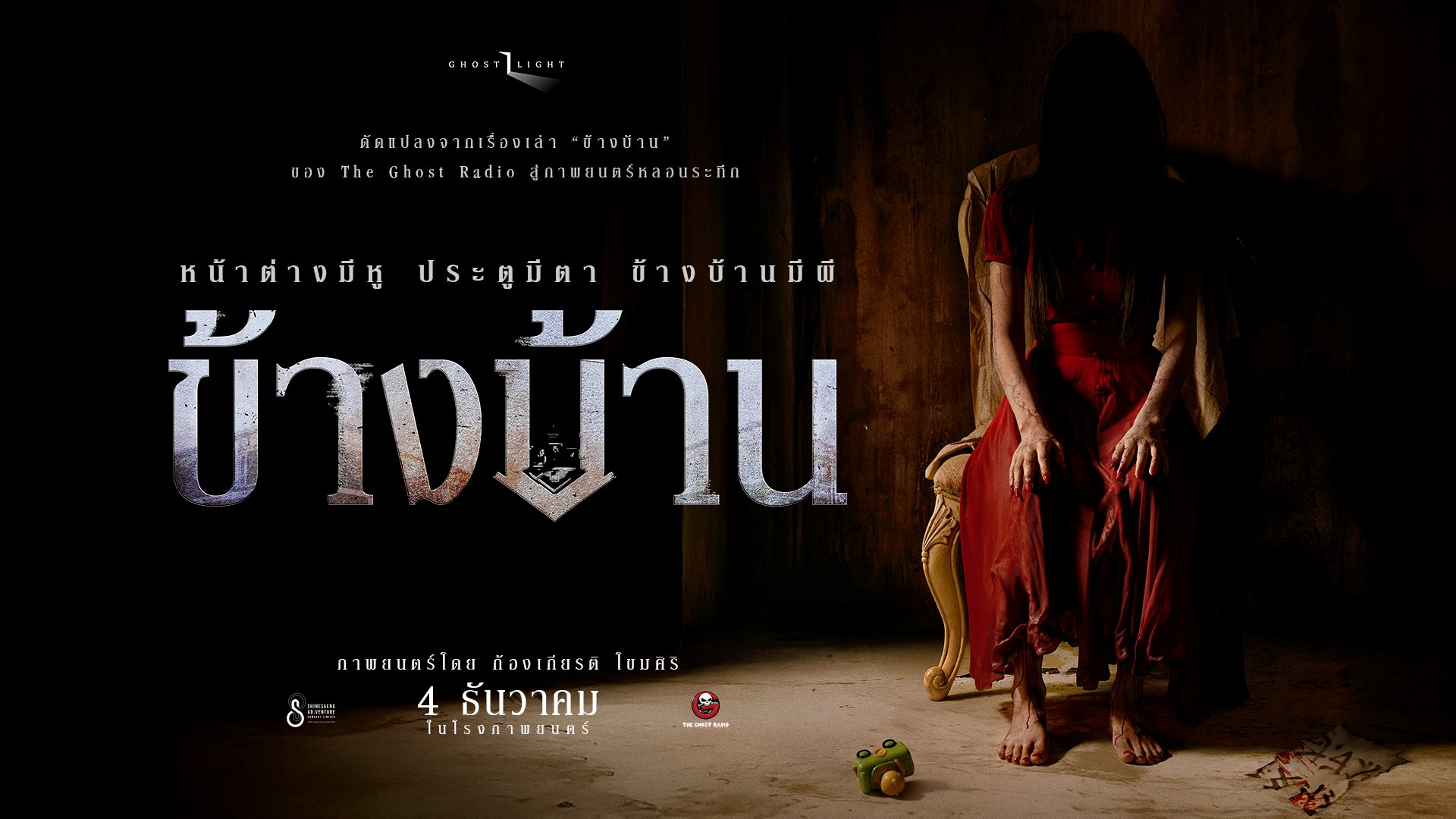 “ฉายแสง แอด.เวนเจอร์” ร่วมกับ “เดอะ โกสต์ เรดิโอ” ส่งท้ายปีด้วยภาพยนตร์สยองขวัญเรื่องแรกของโปรเจกต์ “GHOST LIGHT” (โกสต์ไลท์) ที่จะพาคุณไปสัมผัสบรรยากาศความหลอนระทึกจากเรื่องเล่ามหากาพย์ผีในบ้าน 4 ปี 4 ตอนอย่างภาพยนตร์ “ข้างบ้าน” (OUR HOUSE) มาถ่ายทอดในรูปแบบภาพยนตร์ โดยดัดแปลงจากเรื่องเล่าของ “เดอะ โกสต์ เรดิโอ” ผ่านฝีมือของผู้กำกับสายดาร์ก โขม-ก้องเกียรติ โขมศิริ นำแสดงโดยพระเอกหนุ่มชื่อดัง อาเล็ก-ธีรเดช เมธาวรายุทธ, กชเบล-ศรัณย์รัชต์ เผือกพิพัฒน์ มิสแกรนด์ไทยแลนด์ 2025 และนักร้องสาวสายแซ่บ โบกี้ไลอ้อน-ณิชชาฎา วีระสุทธิมาศ เตรียมหลอน 4 ธันวาคมนี้ ที่โรงภาพยนตร์
