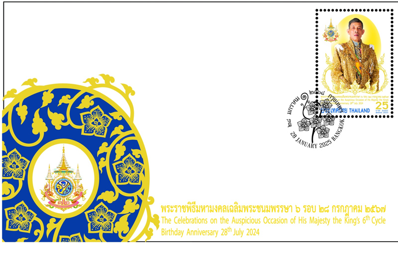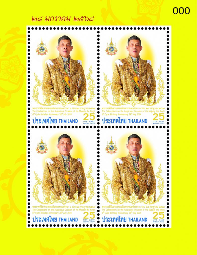 ดร.ดนันท์ สุภัทรพันธุ์ กรรมการผู้จัดการใหญ่ บริษัท ไปรษณีย์ไทย จำกัด กล่าวว่า แสตมป์ที่ระลึกเฉลิมพระเกียรติพระบาทสมเด็จพระเจ้าอยู่หัว เนื่องในโอกาสพระราชพิธีมหามงคลเฉลิมพระชนมพรรษา 6 รอบ 28 กรกฎาคม 2567 ไปรษณีย์ไทยจัดสร้างขึ้นเพื่อเฉลิมพระเกียรติพระบาทสมเด็จพระวชิรเกล้าเจ้าอยู่หัว ในปีมหามงคลสมัย เนื่องในโอกาสที่ทรงเจริญพระชนมพรรษา 6 รอบ หรือ 72 พรรษา โดยได้อัญเชิญพระบรมฉายาลักษณ์พระบาทสมเด็จพระเจ้าอยู่หัวในฉลองพระองค์บรมขัตติยราชภูษิตาภรณ์บนพื้นหลังสีเหลืองอันเป็นสีประจำวันพระบรมราชสมภพประกอบตราสัญลักษณ์งานเฉลิมพระเกียรติฯพร้อมเทคนิคการพิมพ์พิเศษปั๊มดุนนูนบริเวณตราสัญลักษณ์ดังกล่าว พร้อมซิลค์สกรีนกลิตเตอร์สีทองบริเวณฉลองพระองค์จำหน่ายราคาดวงละ 25 บาท (เต็มแผ่น 4 ดวง) ซองวันแรกจำหน่าย 58 บาท ออกจำหน่ายวันที่ 28 มกราคม2568