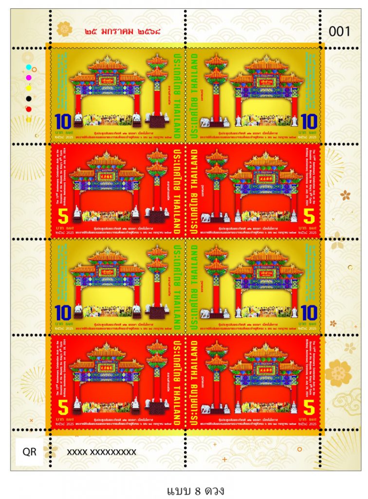 นอกจากนี้ยังมีแสตมป์ที่ระลึกซุ้มประตูเฉลิมพระเกียรติ 72 พรรษาได้รับเกียรติจากภาครัฐ และเอกชน รวมถึงภาคีเครือข่ายจากโครงการ “สสธวท รวมใจ เทิดเอกลักษณ์แห่งปัญจมังกร จารึกความกตัญญูต่อแผ่นดิน” ให้จัดทำแสตมป์ที่ระลึกร่วมเฉลิมฉลองการจัดสร้างซุ้มประตูเฉลิมพระเกียรติ 72 พรรษา ซึ่งซุ้มประตูดังกล่าวถือเป็นสัญลักษณ์แห่งความกตัญญูกตเวทีของพสกนิกรต่อพระบาทสมเด็จพระเจ้าอยู่หัว โดยมีที่มาจากแนวคิดปัญจมังกร: สัญลักษณ์แห่งมังกรทั้งห้า คือ 1 .พระมหากษัตริย์ทรงได้รับการสดุดี เป็น มังกรแห่งมวลมนุษย์ 2. เป็นนักษัตรประจำปีพระบรมราชสมภพ พระบาทสมเด็จพระเจ้าอยู่หัว 3. ปีพุทธศักราช 2567 เป็นนักษัตรปีมังกรตามสุริยคติ 4. วัดเล่งเน่ยยี่ หรือมังกรกมลาวาส เป็นหนึ่งในศูนย์รวมใจพุทธศาสนิกชน 5. ถนนเจริญกรุง ได้ชื่อว่า “ถนนสายมังกร” โดยได้รับพระราชทานชื่อซุ้มประตูเพื่อความเป็นสิริมงคล ได้แก่ “วชิรสถิต 72 พรรษา” หมายถึง พระบาทสมเด็จพระเจ้าอยู่หัวทรงเจริญพระชนมพรรษา 72 พรรษาตั้งอยู่บริเวณสะพานดำรงสถิต และ “วชิรธำรง 72 พรรษา” หมายถึงการจารึกความเทิดทูนของมวลพสกนิกรทั่วประเทศต่อพระบาทสมเด็จพระวชิรเกล้าเจ้าอยู่หัว ตั้งอยู่บริเวณแยกหมอมี แสตมป์ชุดนี้มีด้วยกัน 4 แบบ นำเสนอภาพด้านหน้า – หลังซุ้มประตูทั้ง 2 ซุ้ม แสดงให้เห็นถึงสถาปัตยกรรมอันโดดเด่นด้วยศิลปะแบบจีนภาคเหนือ ฐานซุ้มเป็นฐานปัทม์ ออกแบบโดยกรมศิลปากร และเพื่อเป็นการเชื่อมสัมพันธไมตรีที่ยั่งยืนมาตลอด 50 ปี ของไทยและจีนสถานเอกอัครราชทูตจีนประจำประเทศไทยได้ส่งมอบประติมากรรมหินอ่อนหยกขาวฮั่นไป๋ยู่ แกะสลักเป็นรูปช้าง สิงโต และกลอง ประดับที่ฐานซุ้มประตู แสตมป์ออกจำหน่าย 25 มกราคมนี้ ชุดละ 30 บาท ( 10 บาท 2 ดวง5 บาท 2 ดวง)
