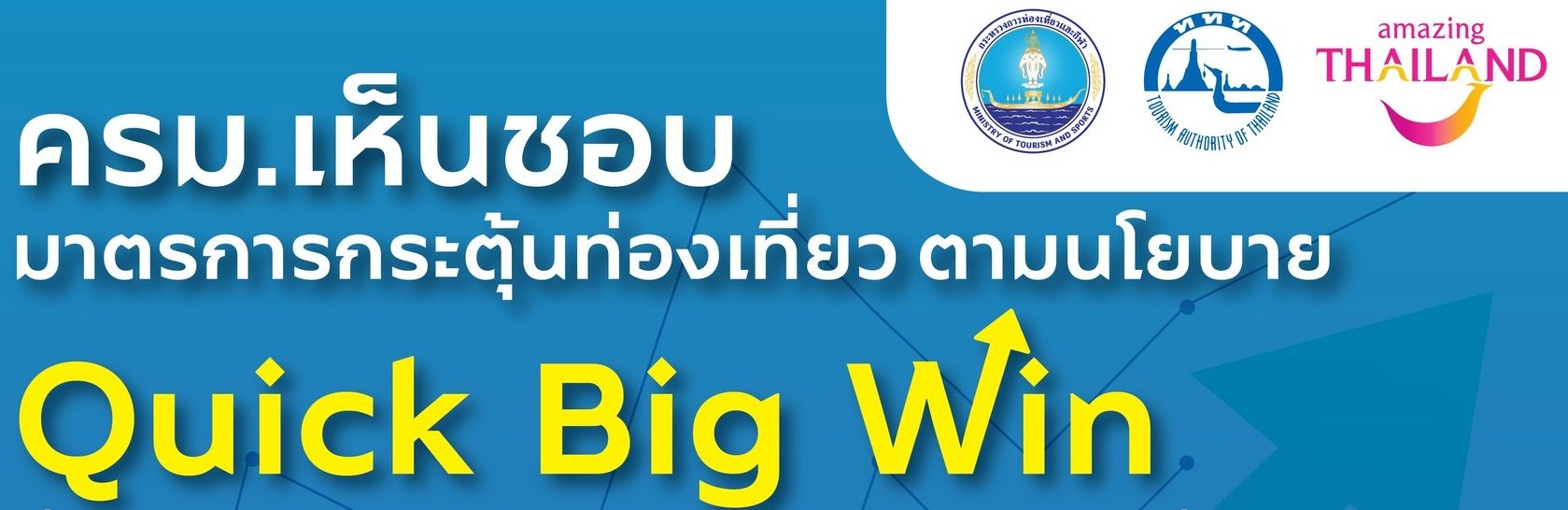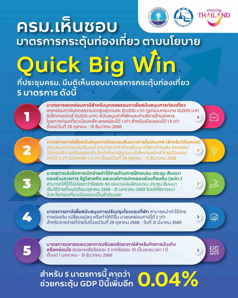 “Quick Big Win” นโยบายเร่งฟื้นเศรษฐกิจรับไฮซีซั่นปลายปีกับ 5 มาตรการกระตุ้นท่องเที่ยวภายในประเทศ ได้แก่ มาตรการภาษีสำหรับบุคคลธรรมดาเพื่อสนับสนุนการท่องเที่ยว มาตรการภาษีเพื่อสนับสนุนการจัดอบรมสัมมนาภายในประเทศ (สำหรับนิติบุคคล) มาตรการเร่งรัดการเบิกจ่ายค่าใช้จ่ายด้านการฝึกอบรม ประชุม สัมมนาของส่วนราชการ รัฐวิสาหกิจ และองค์การปกครองส่วนท้องถิ่น (อปท.) มาตรการภาษีเพื่อสนับสนุนการปรับปรุงโรงแรมที่พัก และมาตรการขยายระยะเวลาการปรับลดอัตราภาษีสำหรับกิจการบันเทิงหรือหย่อนใจ ครอบคลุมสิทธิประโยชน์ทั้งภาคประชาชน ธุรกิจ โรงแรม ร้านอาหาร และกิจการบันเทิง ตั้งเป้าสร้างเม็ดเงินหมุนเวียนและสร้างความสุขให้แก่พี่น้องชาวไทยทั่วประเทศอย่างเป็นรูปธรรม